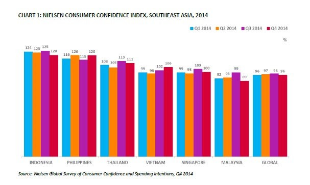 Trong báo cáo Niềm tin tiêu dùng toàn cầu của công ty Nielsen vừa công bố, nhìn chung chỉ số niềm tin người tiêu dùng khu vực Đông Nam Á duy trì ở mức cao trong quý IV/2014.