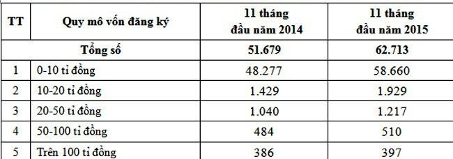 Trong 11 tháng qua, cả nước có 86.853 doanh nghiệp được thành lập mới với tổng số vốn đăng ký là 538.671 tỉ đồng, tăng 28,12% về số doanh nghiệp và tăng 37,66% về số vốn đăng ký so với cùng kỳ năm trước. Tổng số vốn đăng ký bổ sung vào nền kinh tế là 1.280.855 tỉ đồng, bao gồm: tổng số vốn đăng ký của doanh nghiệp đăng ký thành lập mới là 538.671 tỉ đồng và tổng số vốn đăng ký tăng thêm của các doanh nghiệp thay đổi tăng vốn là 742.184 tỉ đồng.