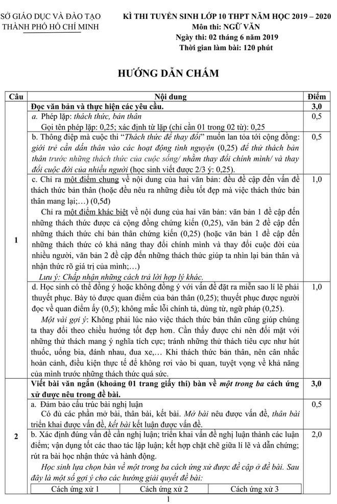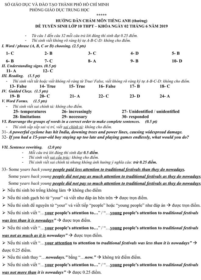 Dưới đây là đáp án chính thức các môn thi trong đợt tuyển sinh vào lớp 10 tại TP.HCM: