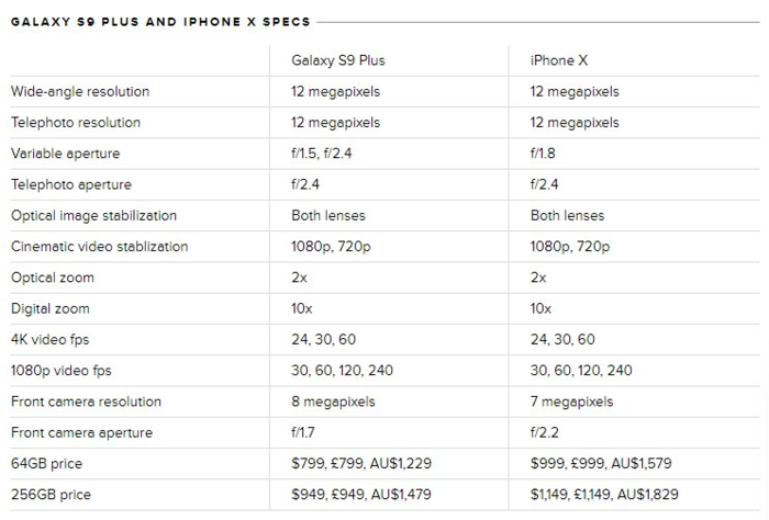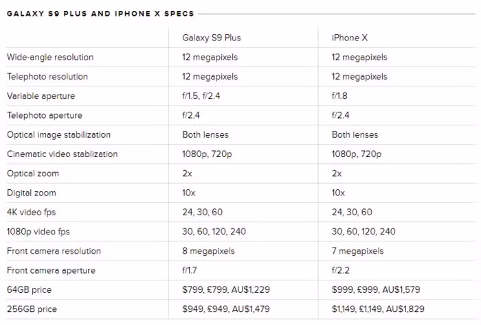 Bảng so sánh thông số và giá cả giữa Galaxy S9 Plus và iPhone X.