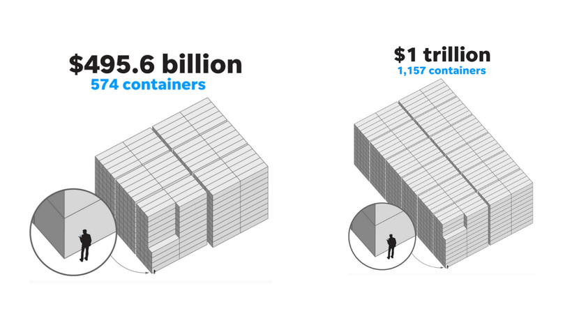 Bạn có thể nhét 2660 cái hộp nói trên vào một container vận chuyển có chiều dài 12 mét. Như vậy cái container này sẽ có giá trị 864,5 triệu USD. Số tiền này dường như là rất lớn rồi, nó là mơ ước của nhiều người. Nhưng nó vẫn chưa được 1% của nghìn tỷ USD.
