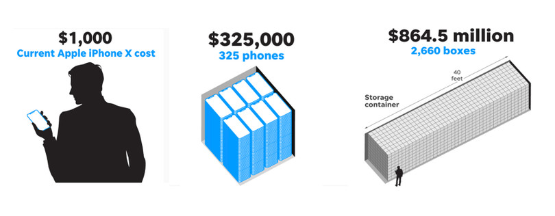 Theo tờ USA Today, hiện một chiếc iPhone X dung lượng 64GB trên thị trường có giá là 1000 USD. Nếu chúng ta lấy những chiếc iPhone X ra khỏi hộp và xếp chồng lên nhau, thì một hộp thể tích 1 foot có thể chứa 325 chiếc iPhone X. Cái hộp này sẽ có trị giá là 325 x 1000 USD = 325 nghìn USD.