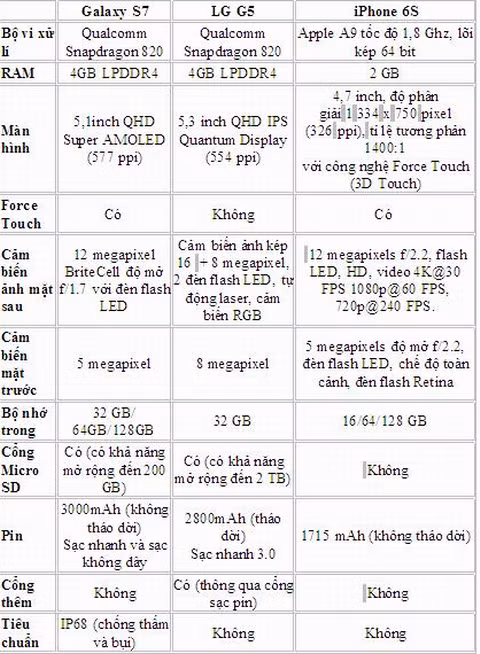 Ngoài thông số kỹ thuật của ba siêu phẩm, mỗi siêu phẩm có một số tính năng khác biệt nhỏ. Về S7, thiết bị này sở hữu màn hình QHD IPS chứ không phải màn hình cảm ứng lực (Force Touch). Về phần mình, iPhone 6S lại được trang bị màn hình cảm ứng lực giúp người dùng tương tác với thiết bị, điều này làm cho cuộc sống của họ tốt đẹp hơn. Lưu ý rằng chỉ riêng Galaxy S7 được cấp chứng nhận IP68 cho phép điện thoại chịu nước và bụi, tính năng mà iPhone 6S và LG G5 vô cùng thèm muốn.