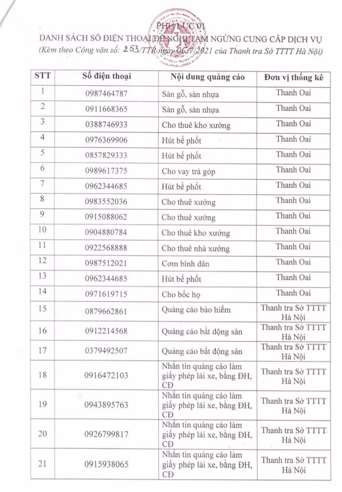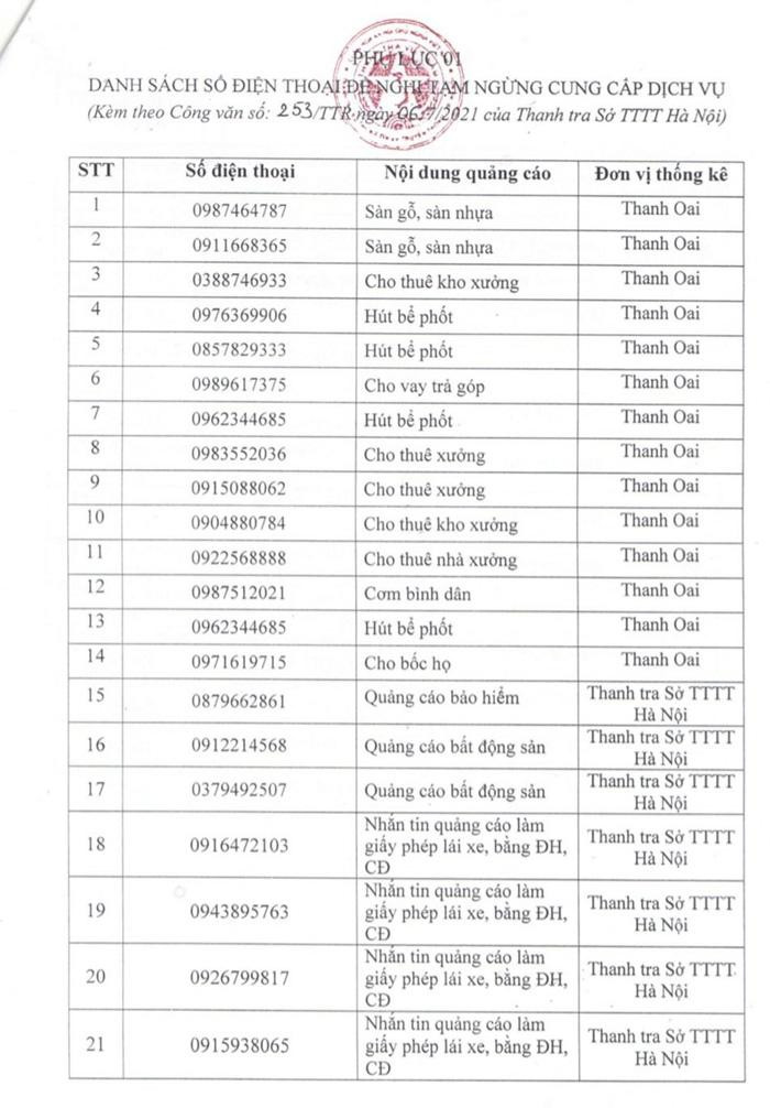 | Danh sách các số điện thoại bị đề nghị tạm ngừng cung cấp dịch vụ. Ảnh: Sở TT&TT Hà Nội. |