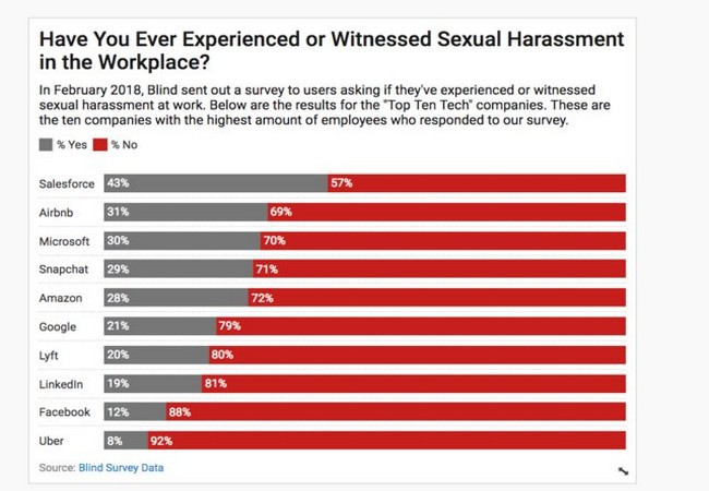 Ứng dụng chat ẩn danh giữa các nhân viên Blind gần đây đã thực hiện một cuộc điều tra thăm dò ý kiến với những người dùng của họ - tất cả đều là những nhân viên thuộc các tập đoàn công nghệ nào đó – xem họ đã từng bị quấy rối tình dục hay đã từng chứng kiến đồng nghiệp mình bị quấy rối tình dục tại nơi làm việc chưa.