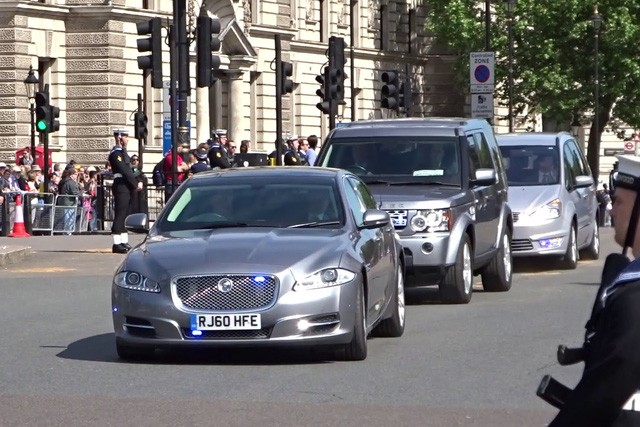 Ngoài cảnh sát dẫn đoàn, xe Jaguar chở nguyên thủ Anh luôn được hộ tống bởi một số xe Range Rover. Ảnh: Getty