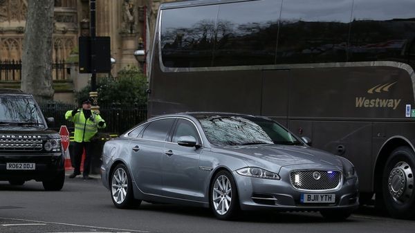 Đó là một chiếc Jaguar XJ Sentinel thuộc đoàn xe được sử dụng từ thời của cựu thủ tướng Anh David Cameron, với khả năng chống đạn mức độ cao nhất - B7, theo tiêu chuẩn châu Âu CEN. Ảnh: Sun