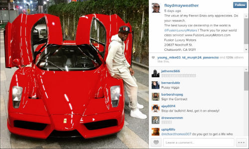 Cho đến tận ngày nay, Mayweather được cho là số ít những người sở hữu một trong những mẫu xe được lấy cảm hứng từ xe đua F1 do Ferrari sản xuất như Enzo. Trên toàn cầu Ferrari chỉ sản xuất có 400 chiếc Enzo nên đây cũng là một mẫu xe không dễ gì tìm kiếm.