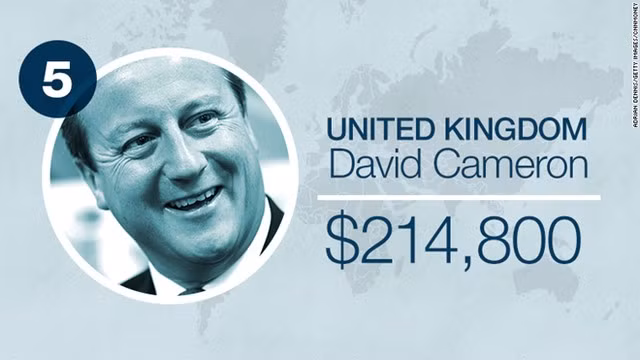 Thủ tướng Anh David Cameron được trả 142.500 bảng (tương đương 214.782 USD) mỗi năm. Số tiền này đã bao gồm lương dành cho vị trí nghị sĩ Quốc hội (67.060 bảng).