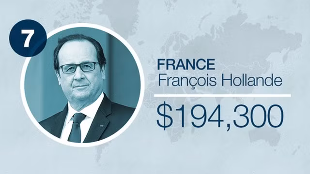 Tổng thống Pháp Francois Hollande sẽ nằm ở vị trí cao hơn nhiều so với số 7 hiện tại nếu như ông không bị cắt giảm 30% lương khi lên nhậm chức năm 2012. Hiện ông được trả 194.251 USD thay vì 225.600 euro (tương đương 274.522 USD).