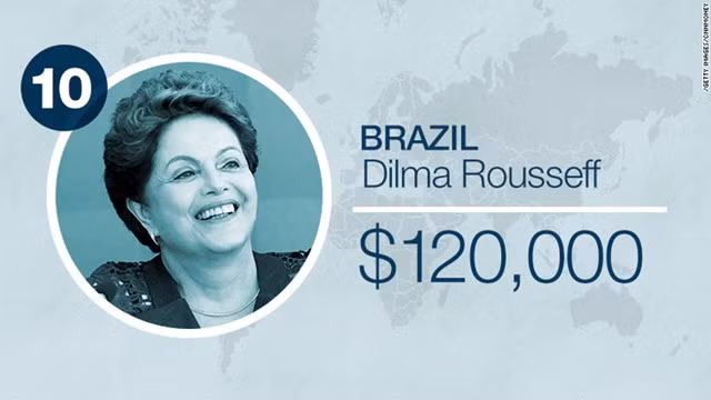 Đứng thứ 10 là nữ Tổng thống Dilma Rousseff của Brazil. Bà được trả 120.000 USD mỗi năm.