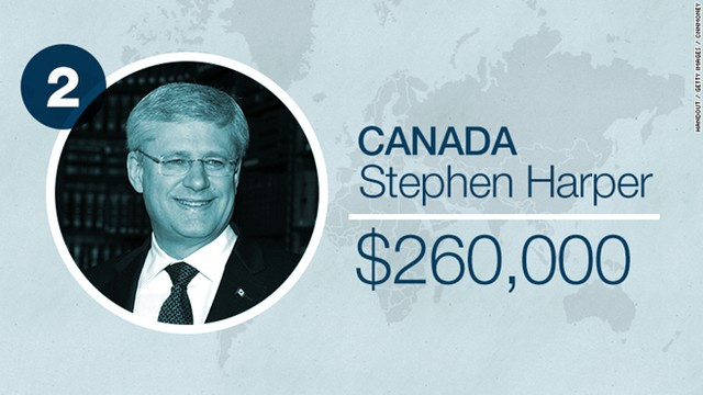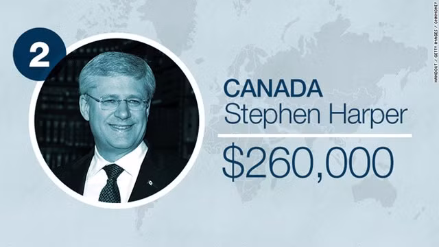 Đứng thứ hai là Thủ tướng Canada Stephen Harper. Ông nhận mức lương 260.000 USD.