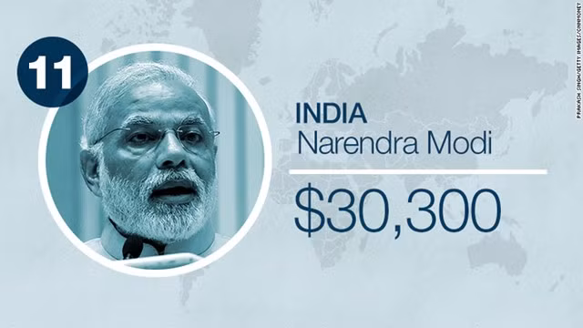 Thủ tướng Ấn Độ Narenda Modi chỉ được trả 1,9 triệu rupee mỗi năm, tương đương 30.000 USD. Đây là con số được tiết lộ chính thức sau khi giới truyền thông Ấn Độ yêu cầu tự do thông tin.