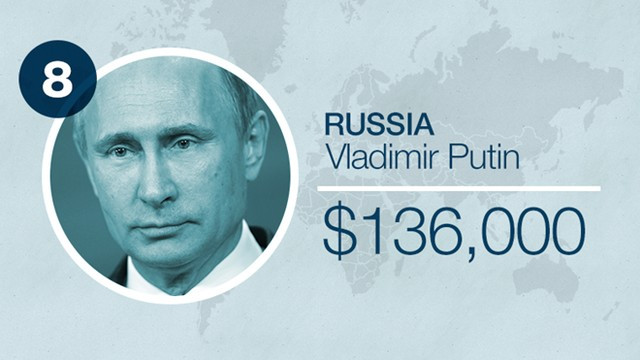 Lương của Tổng thống Nga Vladimir Putin đã giảm 10% vì nền kinh tế Nga rơi vào tình trạng suy thoái sâu. Tuy nhiên, mức lương của ông hiện đang ở đâu so với các lãnh đạo khác trên thế giới? Tờ CNN đã đưa ra bảng thống kê mức lương hiện nay của các Thủ tướng và Tổng thống trên thế giới. Số liệu được đưa ra dựa trên những dữ liệu chính thức mới nhất và đã được quy đổi sang USD theo tỷ giá hiện hành.