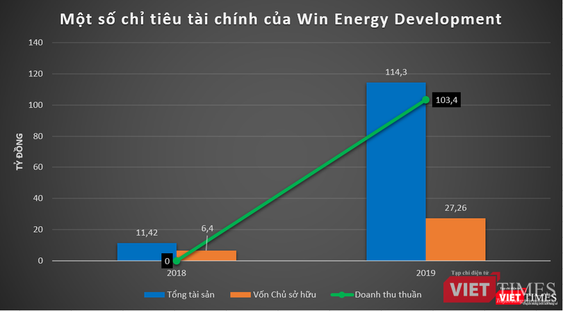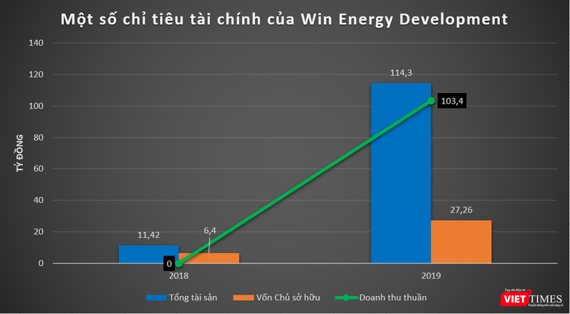 Dữ liệu của VietTimes cho thấy, năm 2018, Win Energy Development không phát sinh doanh thu. Sang năm 2019, doanh thu thuần của doanh nghiệp này đạt 103,4 tỷ đồng; lợi nhuận sau thuế ở mức 12,4 tỷ đồng, trong khi năm 2018 lỗ 178 triệu đồng.