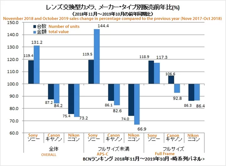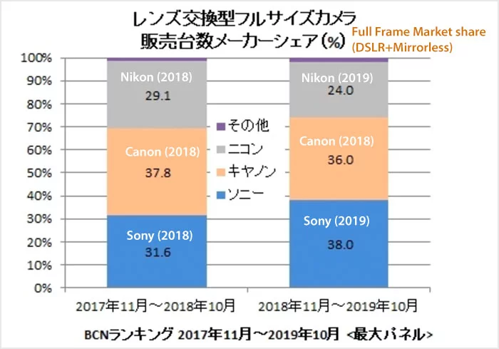 Nikkei nhận định dựa theo báo cáo tài chính này của Nikon, Sony đã vượt qua họ về doanh thu ngành máy ảnh. Trong khi đó, BCN Ranking cũng đưa ra một báo cáo thị trường khác có lợi cho Sony. Thống kê 12 tháng từ tháng Mười Một năm 2018 đến hết tháng Mười năm 2019, Sony là hãng duy nhất đạt tăng trưởng cả về doanh thu lẫn doanh số máy ảnh. Cả hai ông lớn Canon và Nikon đều chứng kiến mức suy giảm lên đến hai chữ số.