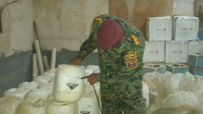 Các binh sĩ của lực lượng dân Iraq thuộc tỉnh Anbar phát hiện hai kho hóa chất trong khu công nghiệp ở phía tây thành phố Ramadi, trước đây từng nằm dưới quyền kiểm soát của IS.