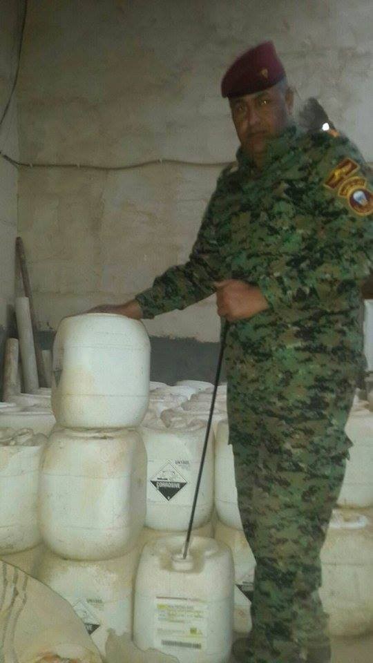 "Hóa chất này được IS sử dụng. Chúng trộn vào thuốc nổ của mìn và tên lửa tự chế rồi bắn vào thường dân và lực lượng an ninh Iraq. Những túi kia cũng chứa các chất độc hóa học, nhưng tôi không thể mở chúng vì không có mặt nạ và găng tay. Trong can là chất độc có mùi rất hăng. IS sử dụng thứ này để tấn công vào thường dân và các lực lượng an ninh Iraq."