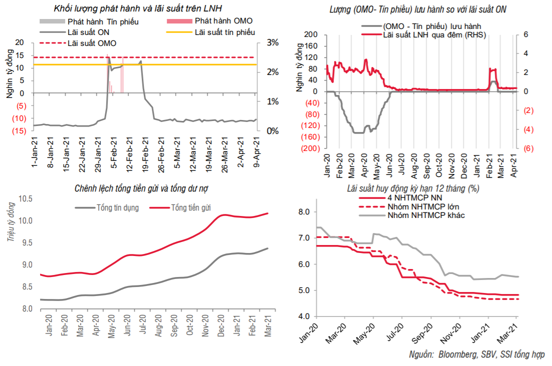 Theo SSI, tín dụng của các ngân hàng thương mại (NHTM) tăng khá tốt trong tháng 3 giúp tăng trưởng tín dụng Quý 1/2021 cao hơn tăng trưởng huy động. Thanh khoản của hệ thống ngân hàng bớt dồi dào hơn so với Quý 4/2020 nhưng vẫn ở mức rất tốt, lãi suất liên ngân hàng sẽ vẫn duy trì ở vùng thấp hiện tại.