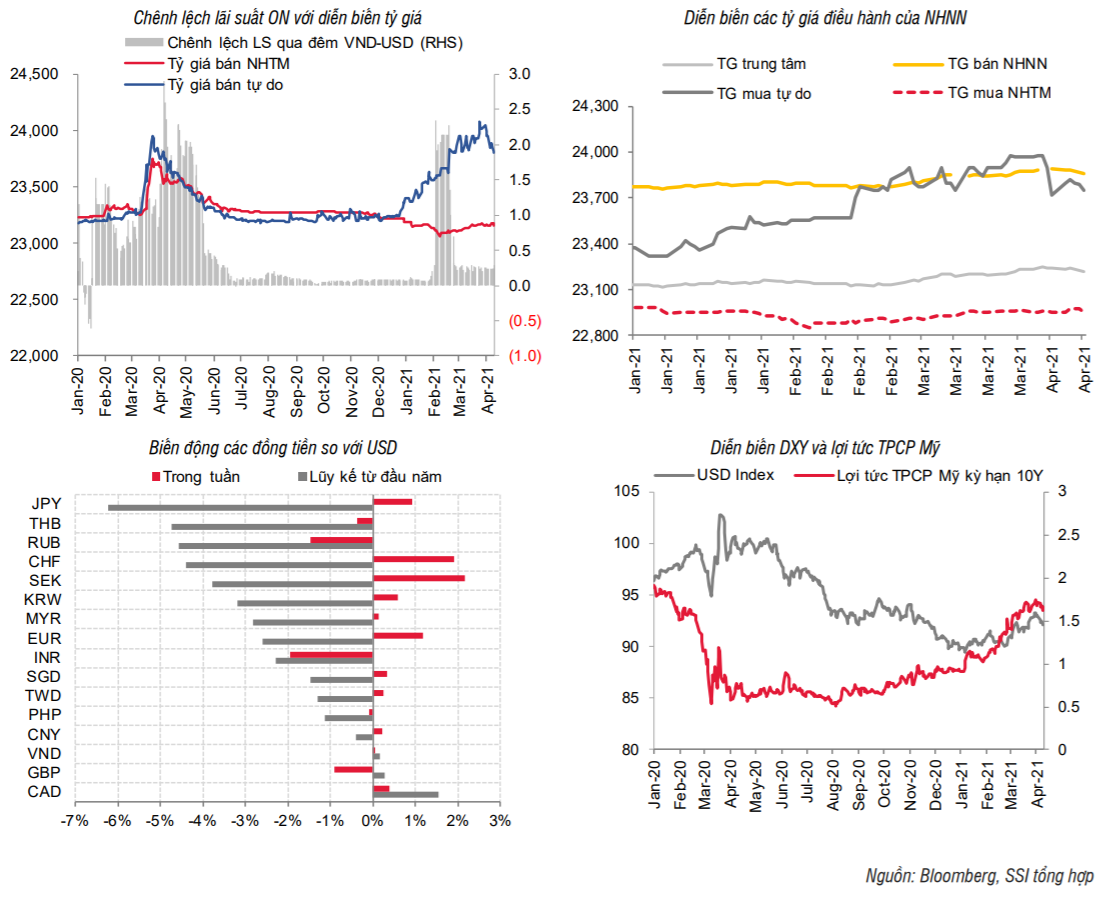 Chỉ số DXY đã điều chỉnh từ mức 93 xuống 92,1, hầu hết các đồng tiền có một tuần phục hồi so với USD, trong đó các đồng tiền tăng giá mạnh nhất trong tuần là SEK (2,16%); CHF (1,9%); EUR (1,2%); JPY (0,9%)... Lợi tức trái phiếu chính phủ Mỹ cũng điều chỉnh giảm 0,03-0,11% ở các kỳ hạn.