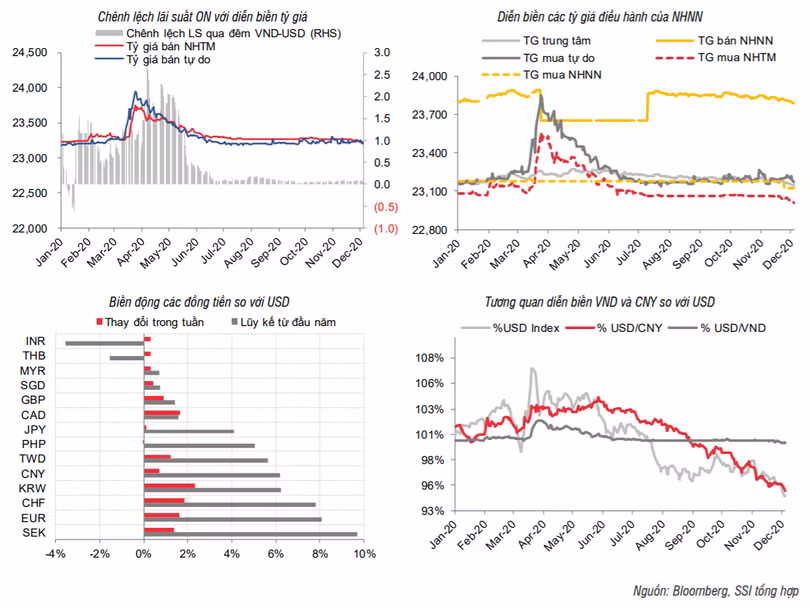 Tất cả các đồng tiền đều ghi nhận một tuần tăng giá so với USD: KWR (tăng 2,33%), CHF (tăng 1,84%), EUR (tăng 1,63%), GBP (tăng 0,89%), CNY (tăng 0,72%), … Tính từ đầu năm đến nay, chỉ số DXY đã giảm khoảng 6%, xu hướng giảm của đồng USD có thể sẽ tiếp diễn trong năm 2021 nếu Cục dự trữ Liên bang Mỹ (FED) tiếp tục duy trì chính sách nới lỏng.