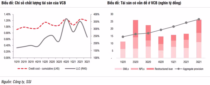 SSI cho hay, vào cuối quý 3/2021, nợ nhóm 2 của Vietcombank đã tăng 59% so với quý trước lên 10.900 tỉ đồng, xuất phát từ một số doanh nghiệp thuộc ngành khách sạn và vận tải ở miền Trung và miền Nam.
