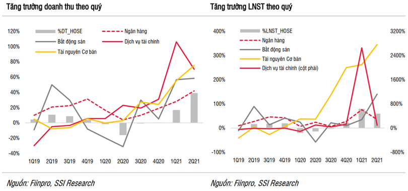 Lợi nhuận sau thuế trên HoSE trong quý 2/2021 (các doanh nghiệp đại diện 97,2% vốn hóa đã công bố) tăng trưởng 59,31% so với cùng kỳ, thấp hơn so với mức 79,7% ở quý 1/2021 do tăng trưởng chậm lại ở nhóm Ngân hàng và nhóm Chứng khoán.