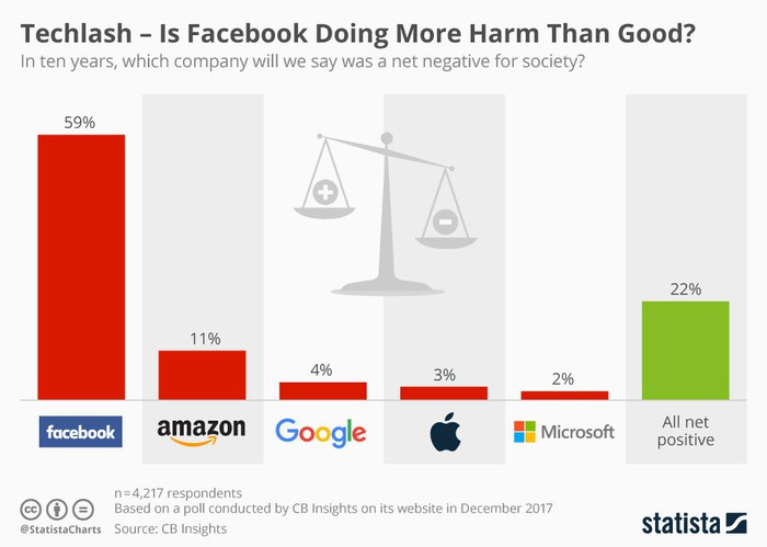 Hãy cùng nhìn lại một số dữ liệu khảo sát về Facebook để thấy sau 15 năm Facebook đang như thế nào. Theo khảo sát của CB Insights, sau 10 năm, Facebook là công ty gây ảnh hưởng tiêu cực nhất cho xã hội với 40% trên 4.000 người tham gia tán thành. Đứng sau Facebook là Amazon với 11% và Google với 4%.