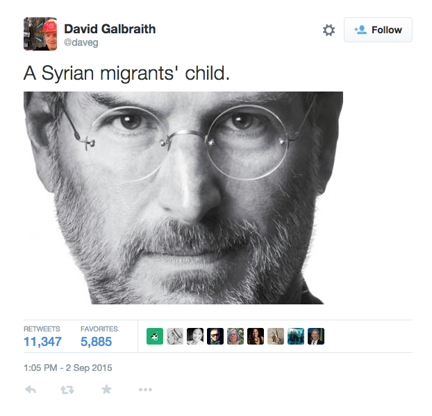 Hình ảnh cậu bé Syria nằm trên bãi biển khiến cho chúng ta không khỏi tiếc thương và hơn thế nữa nó khiến chúng ta nhớ lại một con người vô cùng đặc biệt. Đó chính làSteve Jobs, ông cũng là một đứa con của người tị nạn Syria.