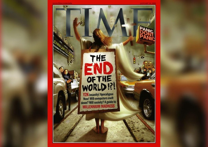 Tạp chí danh tiếng Time đã đặt trang bìa dòng chữ "The End of the World!?!", ám chỉ rằng Y2K có thể làm thảm họa diệt vong toàn cầu. Ảnh: Throwbacks.