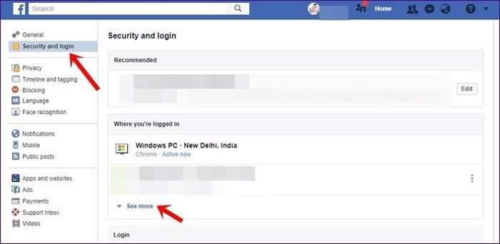 Bước 2: Từ cột bên trái, chọn Security and login. Bên dưới mục Where you’re logged in, bấm vào See more.