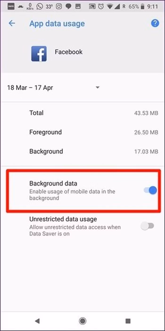 Một cài đặt khác bạn cần biết đó là giới hạn dữ liệu. Khi được kích hoạt, ứng dụng sẽ không đồng bộ dữ liệu trong nền, khiến cho không có thông báo đẩy. Vào Apps bên trong mục Settings của điện thoại bấm vào Facebook > Data usage. Tìm tùy chọn Background data và bật lên.