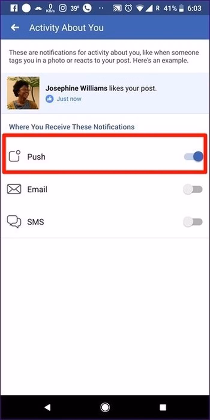 Tại đây, bạn xem được Facebook có thể gửi thông báo loại nào. Bấm vào Activity about you, kiểm tra xem Push có được bật không.