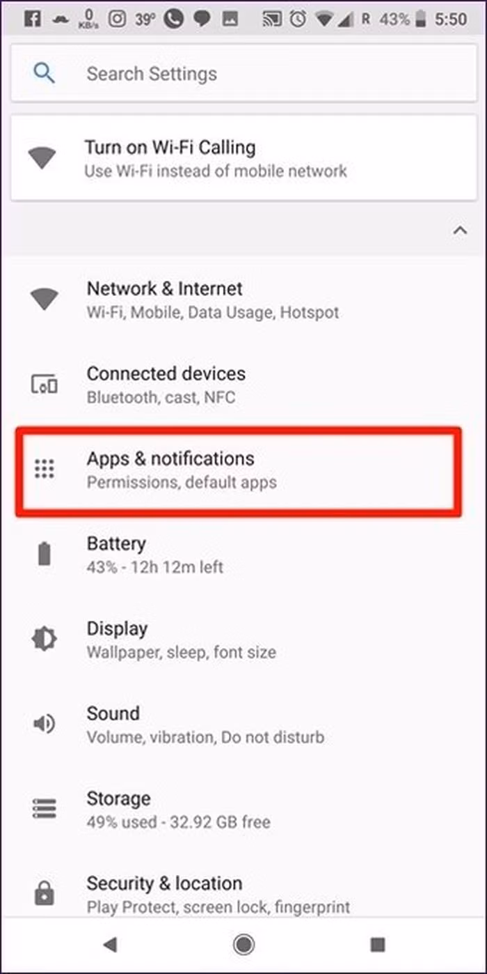 Bước 1: Bấm Settings trên điện thoại > Apps hoặc Apps & Notifications