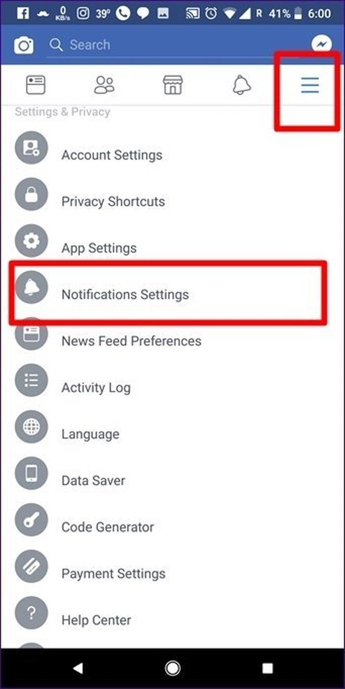 Ngoài cài đặt thông báo trên Android, phần lớn các ứng dụng đều có thiết lập riêng. Facebook cũng như vậy. Để kiểm tra cài đặt thông báo của Facebook, bấm vào biểu tượng ba đường kẻ ngang ở góc trên cùng bên phải, cuộn xuống rồi chọn Notifications Settings.