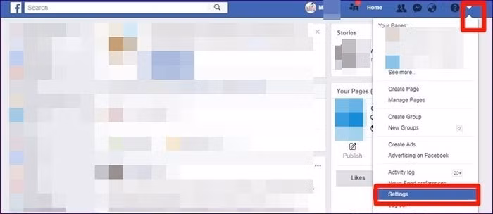Bước 1: Vào Facebook trên máy tính, chạm vào mũi tên nhỏ ở góc trên cùng bên phải, chọn Settings.