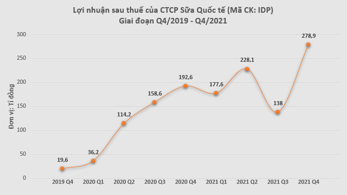 CTCP Sữa Quốc tế (Mã CK: IDP) vừa công bố kết quả kinh doanh quý 4/2021 với doanh thu thuần đạt 1.214,2 tỉ đồng, tăng 20,4% so với cùng kỳ năm trước. Doanh thu từ hoạt động tài chính của IDP đạt 24,4 tỉ đồng, tăng 52,5% so với cùng kỳ năm 2020.