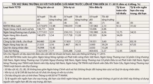 Theo số liệu của NHNN, tổng tài sản có toàn hệ thống tổ chức tín dụng tăng từ 6.865.068 tỉ đồng vào cuối tháng 10-2015 đến 7.021.019 tỉ đồng vào cuối tháng 11. Trong đó, tổng tài sản tăng mạnh nhất thuộc nhóm ngân hàng quốc doanh, tăng 11,98% so với cuối năm 2014, trong khi nhóm ngân hàng cổ phần chỉ cải thiện nhẹ, tăng 3,31%.