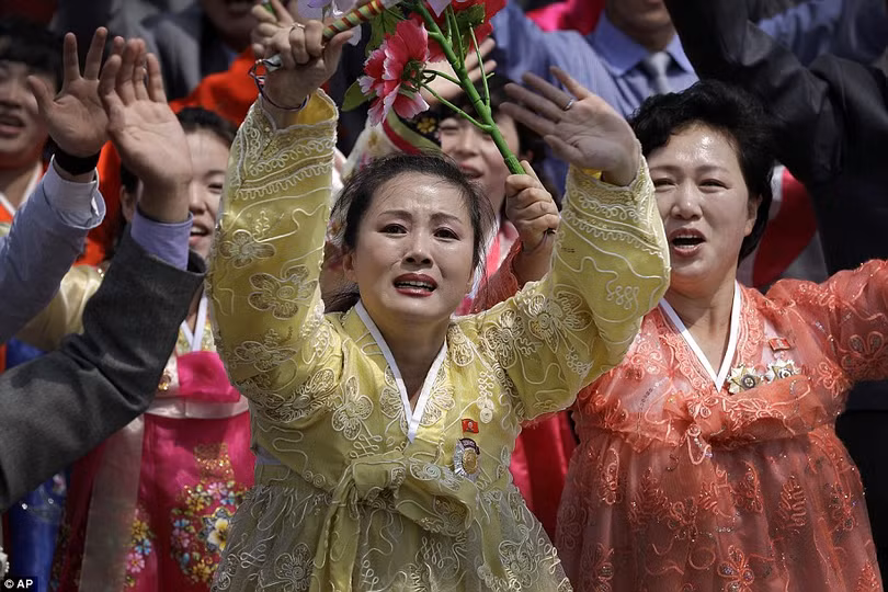 Ông Kim Jong un trong một bộ đồ kiểu phương Tây, có mặt trên Quảng trường Kim Nhật Thành, vẫy chào các quân nhân Triều Tiên, khi các đơn vị diễu hành qua khán đài và đồng thanh hô: "Muôn năm" trong lời chúc mừng kỷ niệm 105 năm ngày sinh của cố chủ tịch Kim Nhật Thành.