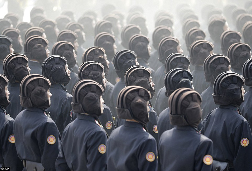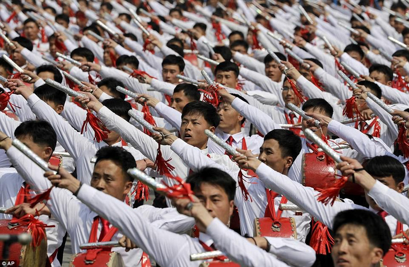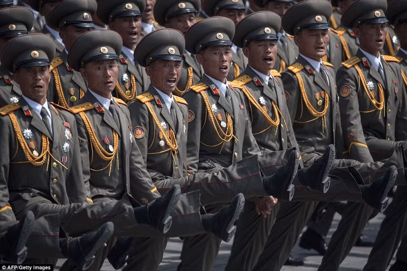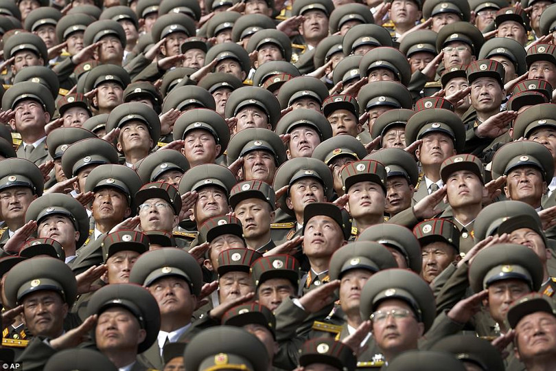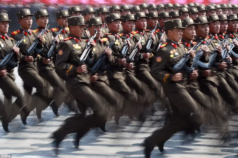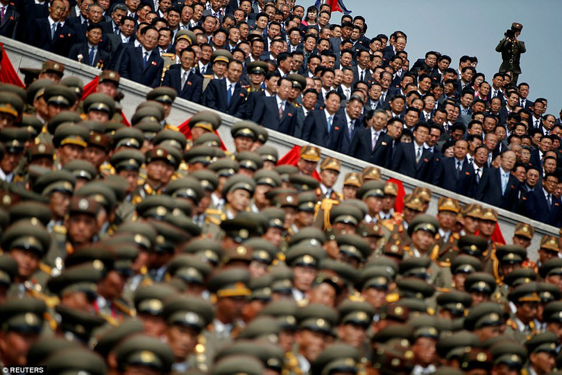 Nhà lãnh đạo Triều Tiên, chủ tịch Kim Jong-un nhiệt liệt chào mừng các lực lượng vũ trang khi các đơn vị quân đội diễu hành qua đài, phô diễn sức mạnh quân sự và khả năng sẵn sàng chiến đấu trong bối cảnh nguy cơ cuộc chiến tranh hạt nhân đang đe dọa quốc gia này.