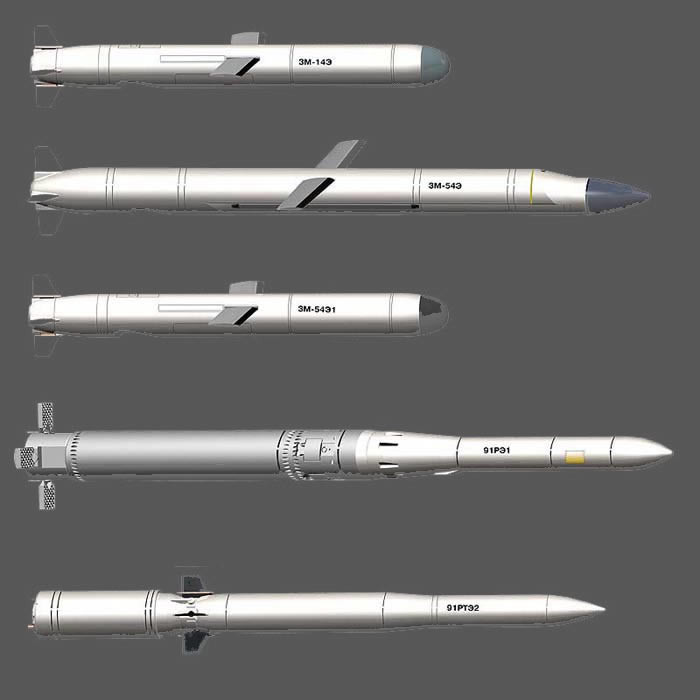Tên lửa 3M14 “Kalibr”: đưa vào biên chế năm 2012, có chiều dài 7,2m, chiều dài bao gồm động cơ đẩy là 8,09m, đường kính đạn 0,514 mm, đường kính ống phóng là 533, sải cánh 3,3m, khối lượng khi bay là 1320 kg, khối lượng khi phóng là 1700 kg. Tên lửa mang đầu đạn nổ phá mảnh có khối lượng 450 kg, đầu đạn hạt nhân có đương lượng nổ là 100 – 200 KT, tốc độ bay là 0,7M, tầm bay từ 1500 km đến 3000 km
