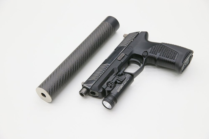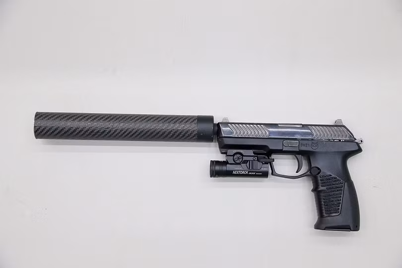 | Nhà mỹ thuật công nghiệp Vladimir Pirozhkov với súng ngắn Udar gắn nòng giảm thanh. Ảnh: RIA Novosti. |