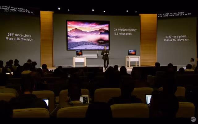 Sản phẩm này có một màn hình cảm ứng cực lớn, 28-inch tỉ lệ 3:2 khá hiếm hiện nay. Không hề bất ngờ khi màn hình này có độ phân giải UltraHD siêu nét. Với một màn hình 4K ở kích thước này, mật độ điểm ảnh lên tới 192PPI, Microsoft mô tả độ nét của màn hình này tương đương với đời thực.