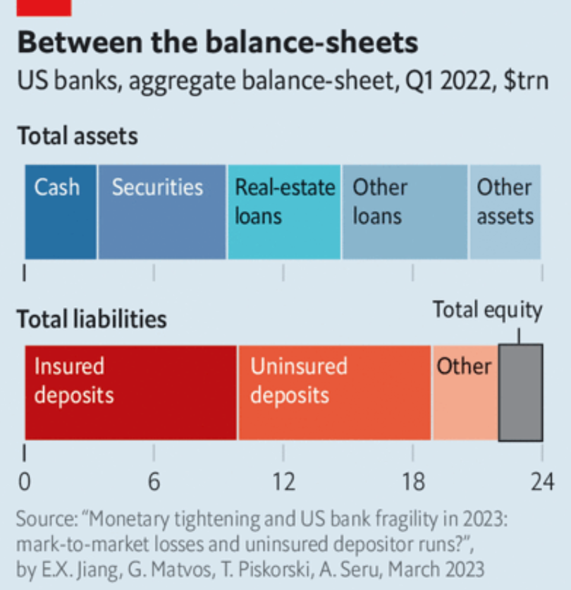 Khối tài sản này được các ngân hàng Mỹ gây dựng dựa trên lượng tiền gửi khổng lồ từ phía khách hàng, lên tới 19.000 tỉ USD. Trong đó, gần một nửa được bảo hiểm bởi FDIC. Để phòng ngừa rủi ro, các ngân hàng có 2.000 tỉ USD vốn cấp 1 (tier-one equity).