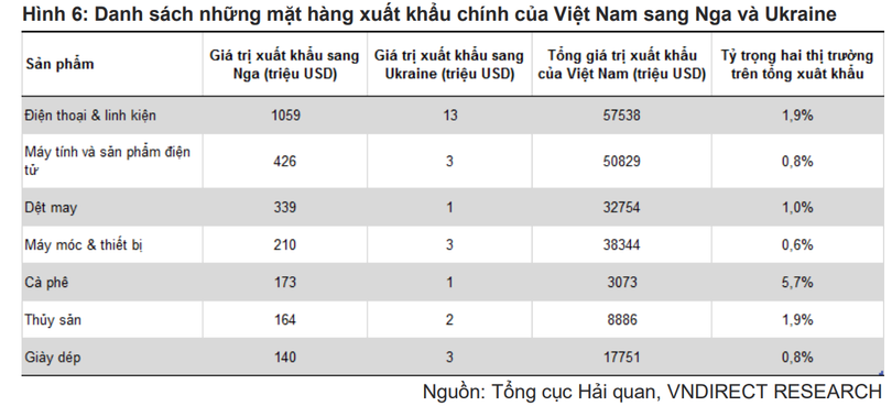 Theo đó, Nga và Ukraine không phải là thị trường xuất khẩu chính cho bất kỳ sản phẩm nào của Việt Nam. Tuy nhiên, nếu xung đột Nga-Ukraine kéo dài, tác động gián tiếp đến thương mại và nền kinh tế Việt Nam sẽ lớn hơn do nhu cầu từ EU và Mỹ chậm lại.