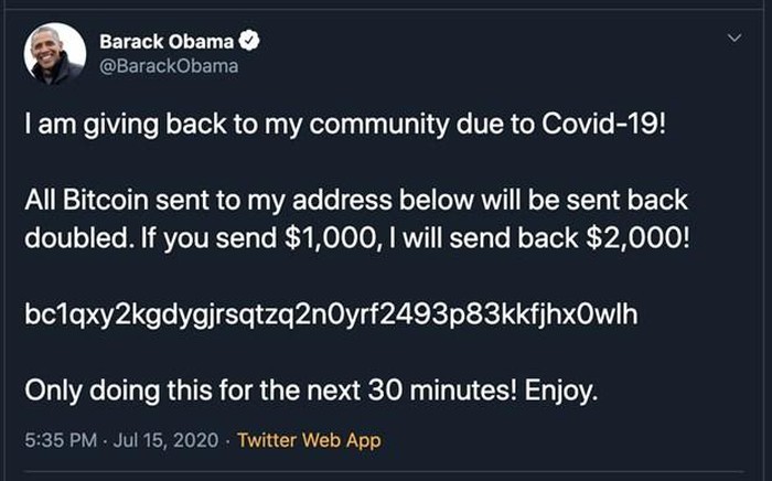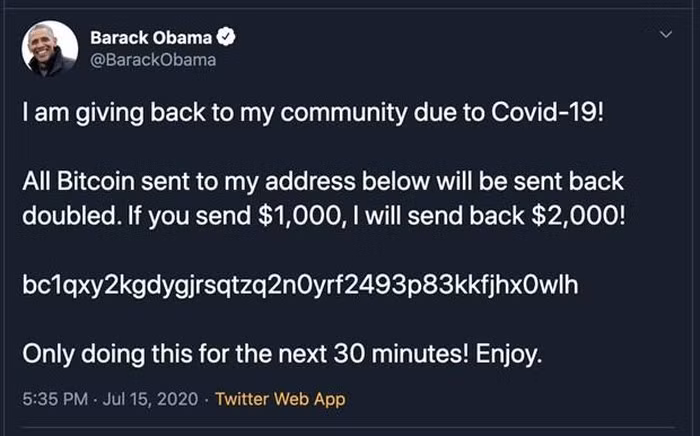 Ngày 15/7, một loạt các tài khoản Twitter của những nhân vật nổi tiếng, trong đó có tài khoản của cựu Phó Tổng thống Joe Biden, cựu Tổng thống Barack Obama, Giám đốc điều hành Tesla Elon Musk và nhà đồng sáng lập Microsoft Bill Gates đã bị xâm phạm trong một vụ được cho là lừa đảo tiền ảo (bitcoin).