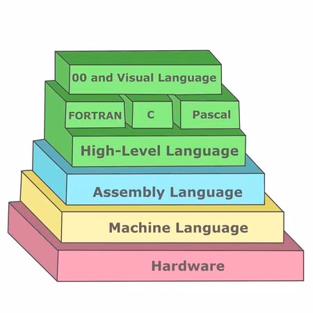 Ở trên, chúng ta đã biết phần cứng đằng sau quá trình thực thi mã máy. Tiếp theo, hãy nói về các cấp độ của phần mềm cần thiết cho việc thực thi của phần mềm. Chương trình đầu tiên cần đến là Asembler (trình dịch hợp ngữ), có chức năng chuyển đổi ngôn ngữ asembly (hợp ngữ) thành mã máy. Một ngôn ngữ cấp độ assembly là một ngôn ngữ cấp thấp, đóng vai trò như một chương trình trung gian giữa một ngôn ngữ lập trình bậc cao (Python, C++, Java) và mã máy. Biểu đồ bên dưới sẽ cho thấy kiến trúc của bất kỳ phần mềm nào: