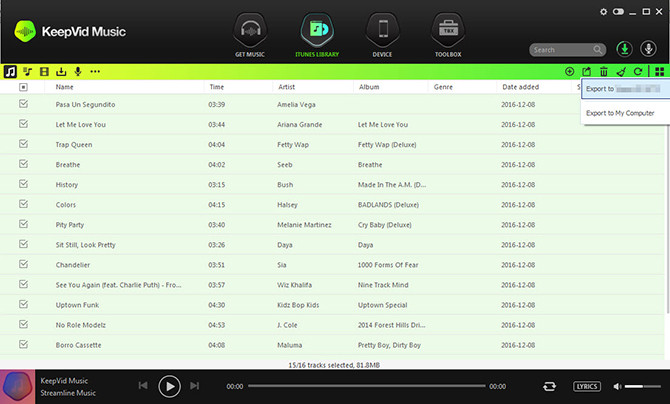 Bạn chọn mục iTunes Library trên giao diện chính và sau đó bấm vào biểu tượng download để thấy danh sách các bài hát đã tải về. Lựa chọn bài hát mà bạn muốn chuyển, nhấn vào biểu tượng Export ở góc trên bên phải. Một danh sách các tùy chọn sẽ xuất hiện, từ đó bạn chọn Export to My Computer, chọn tiếp thư mục đích trên máy tính Windows/Mac mà bạn muốn lưu bài hát, sau đó bấm OK. Bài hát sẽ được trích xuất thành công vào máy tính và bạn có thể nhìn thấy nó trong thư mục đích.