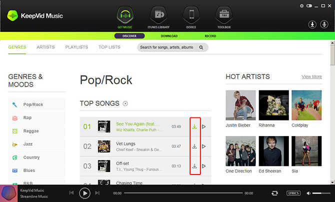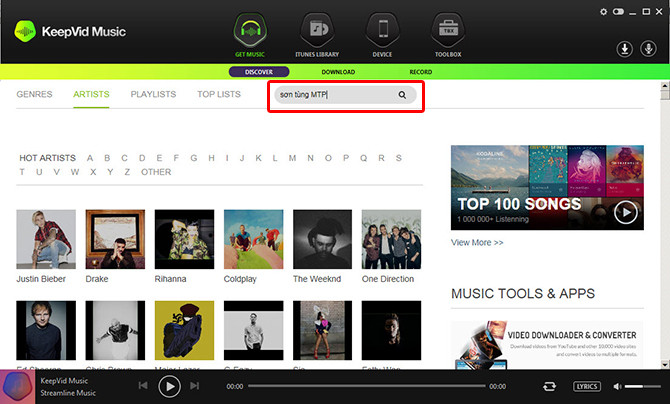 KeepVid Music cung cấp sẵn một thư viện nhạc phong phú với 4 module ở phía dưới mục Discover gồm Genres (thể loại nhạc), Artists (nghệ sĩ), Playlists (danh sách nhạc) và Top lists (danh sách nhạc số được bình chọn nhiều nhất).