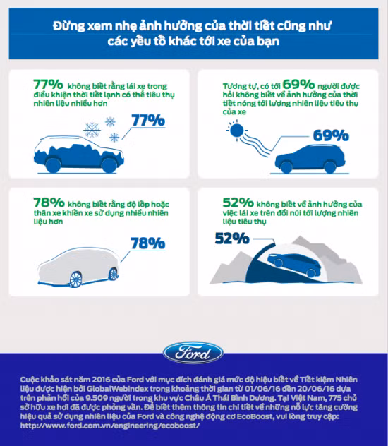 Theo một nghiên cứu mới đây cho biết cùa Ford, 92% người lái xe Việt Nam cho biết họ nắm rõ những phương pháp giúp tiết kiệm nhiên liệu tối đa, và 93% thì cho rằng họ thực hiện những phương pháp đó hàng ngày. Nhưng phần lớn là họ đều làm sai!